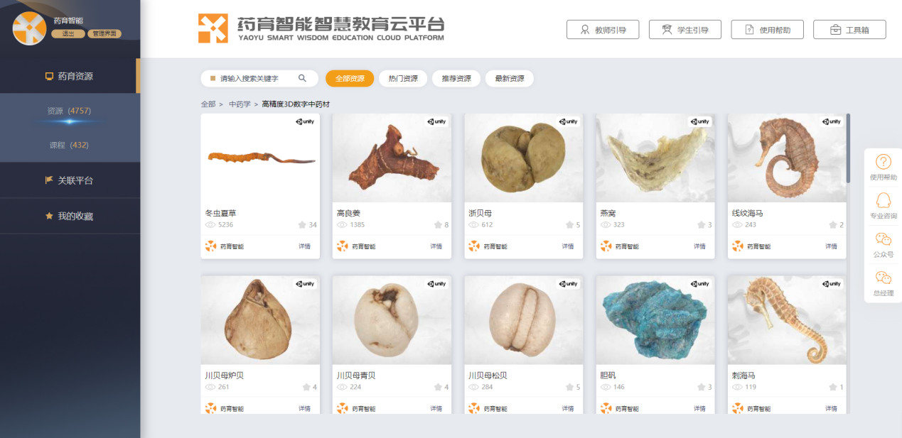 《中药资源-药用植物的采摘及药用植物的鉴别》课程资源,是药育智能采用多源数据融合三维环境重建技术、超精细光谱扫描3D重建等技术,用户在构建的虚拟野外生长环境中,进行地道药材的植株辨认,野外采摘,药材粗加工等工艺操作。目前,药育智能智慧教育云平台公开394种高精度3D数字中药材、50种中药鉴定资源。