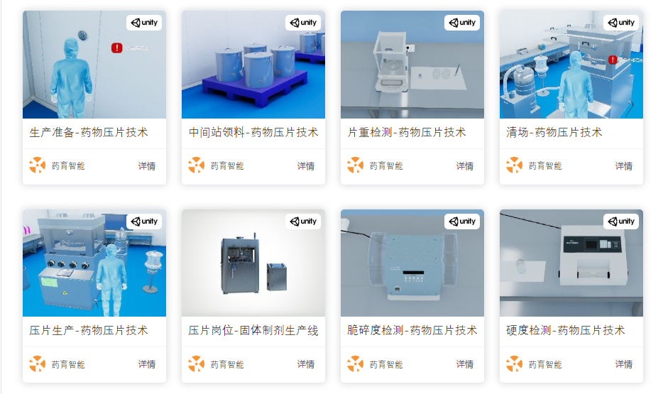 武汉理工大学开设的《小容量注射剂》与《固体制剂》生产线虚拟仿真实训课程,同属于药育智能《药品生产 GMP 虚拟实训仿真平台》中的知识章节模块;固体制剂生产线细分为颗粒剂生产线、片剂生产线、胶囊剂生产线;该课程针对药学相关专业实践教学需求,以2010版药品生产管理规范(GMP)作为实施指南,以药品生产实践操作为主线,结合现代药物制剂生产工艺、药物制剂设备、岗位标准化操作(SOP)、药品生产过程质量控制以及车间管理等内容,借鉴严肃游戏(Serious Game)与互动模式吸引用户进行RBL为导向的学习模式;弥补教学脱离实际生产的弊端,提高用户对药品实际生产的认知与理解。