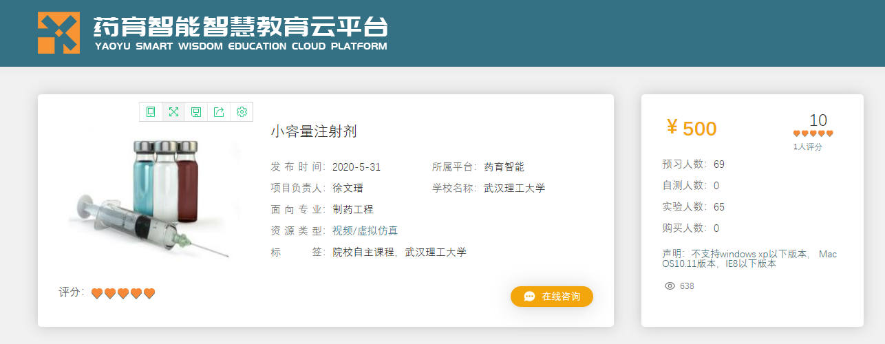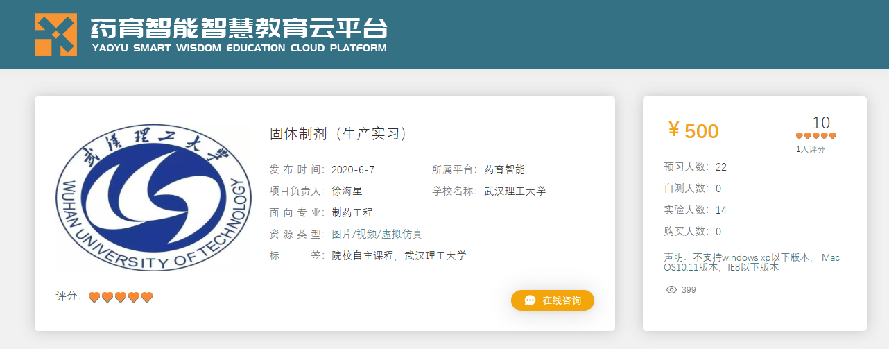 武汉封城,各地严控,线上教学开展刻不容缓;制药工程系的实习、实验实训遭遇严重挑战。很庆幸南京药育智能科技有限公司发扬企业担当,将千余款医药领域精品教学资源,通过药育智能智慧教育云平台承载,免费支撑医药学高等专科院校线上教学工作开展;声援国家“停课不停学”号召,践行药育智能服务于“知识的有效传递”的企业愿景;并通过微信群将老师用户汇聚一起,及时收集老师教学需求,提供高质量教学保障服务。