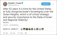 美国总统发表推特称认可戈兰高地为以色列领土,丢下一枚地缘政治炸弹,此举引发阿拉伯世界国家不满,欧盟、俄罗斯均不认可特朗普的...