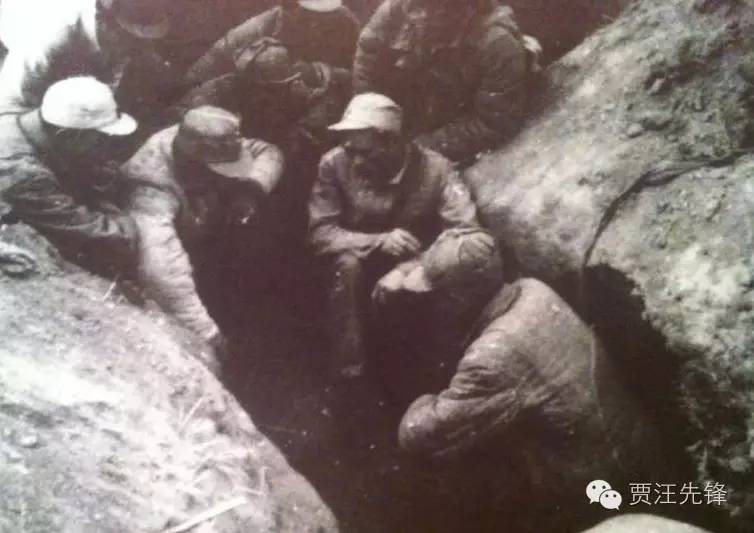 战士们在战壕里以草御寒